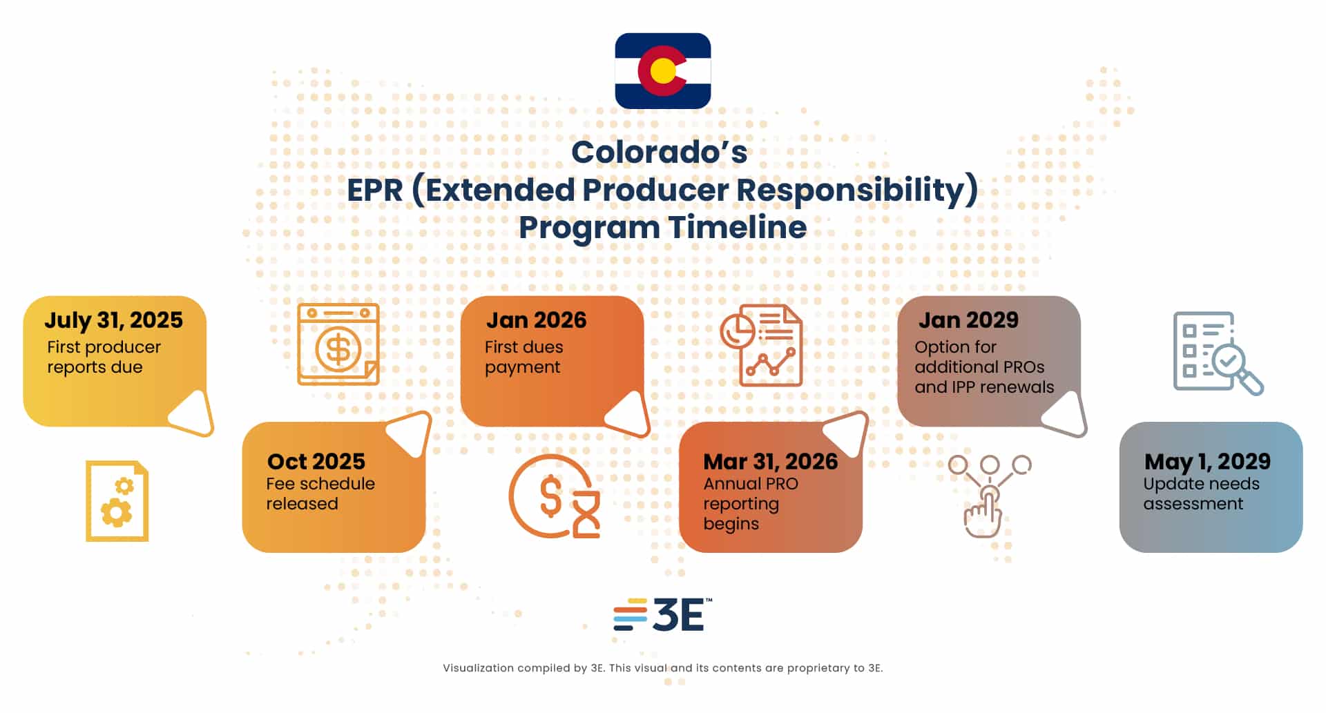 As for industry action, the first producer reports are due on July 31, 2025. Producers must sign the Colorado State Addendum and submit data on the weight and type of packaging and paper materials sold in Colorado, including estimates of their recyclability and content composition, through the CAA's state-specified reporting portal. Reports will be due annually and must be supported by documentation retained for at least five years.