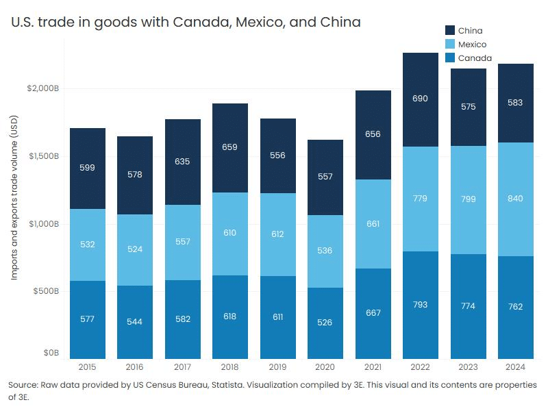 Since that first week in February, the U.S. and the nations involved have engaged in a back-and-forth trade war, with announcements of tariffs being made and taken back sometimes multiple times in a day. It is hard to know for sure what the final policies will be, but one thing is certain - the trade war between the U.S. and its most important trade partners will have profound effects on U.S. states and industries.