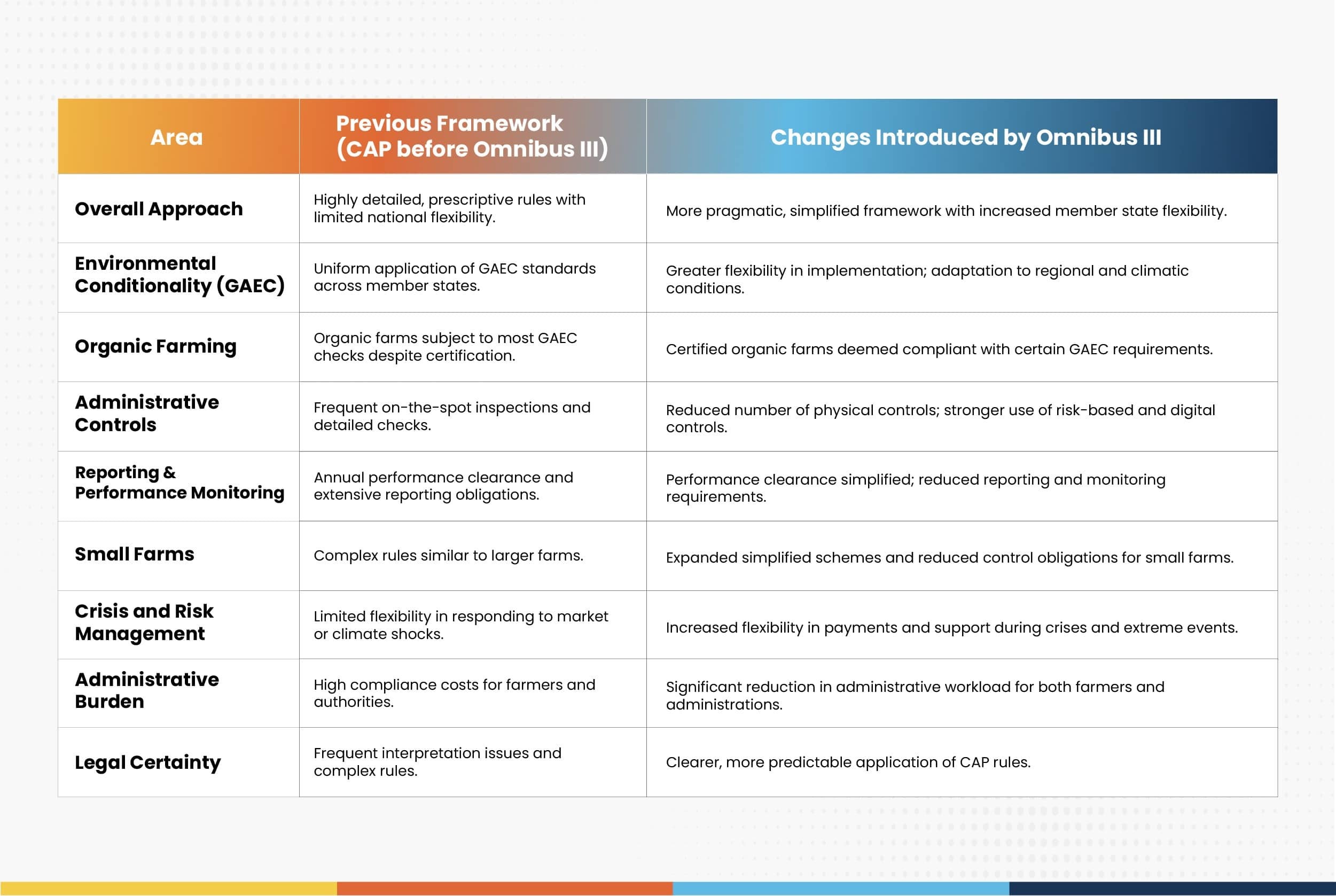 Dans l’ensemble, Omnibus III marque une évolution vers un modèle de mise en œuvre de la PAC plus pragmatique. Il établit un équilibre entre les objectifs environnementaux, les réalités économiques et la capacité administrative, dans le but de restaurer la confiance des agriculteurs tout en veillant à ce que la politique agricole de l’UE reste efficace, crédible et à l’épreuve du temps.
