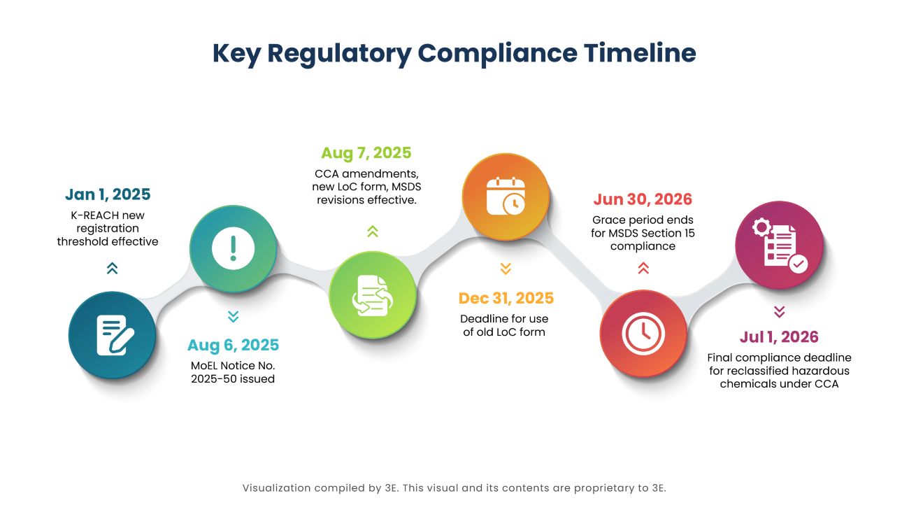 2025年8月、韓国は化学物質管理法(CCA)、化学物質の登録と評価に関する法律(K-REACH)、雇用労働省(MoEL)の製品安全データシート(MSDS)基準など、化学物質規制の枠組みに対する抜本的な改革を最終決定した。これらの改正は、製造業者、輸入業者、川下ユーザーのいずれにも影響を与える、韓国の規制情勢における最も重大な変化のひとつである。