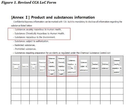 企業は、新しいCCA危険有害性分類を含めるために、複数の書類を更新する必要があります。企業は、危険有害性の定義を満たす化学物質を特定するために、改訂された確認書(LoC Form、図1参照)を使用しなければならない。CCA第9条に基づき、韓国への製品の製造または輸入の前に化学物質の特定が義務付けられており、LoCの提出が義務付けられています。