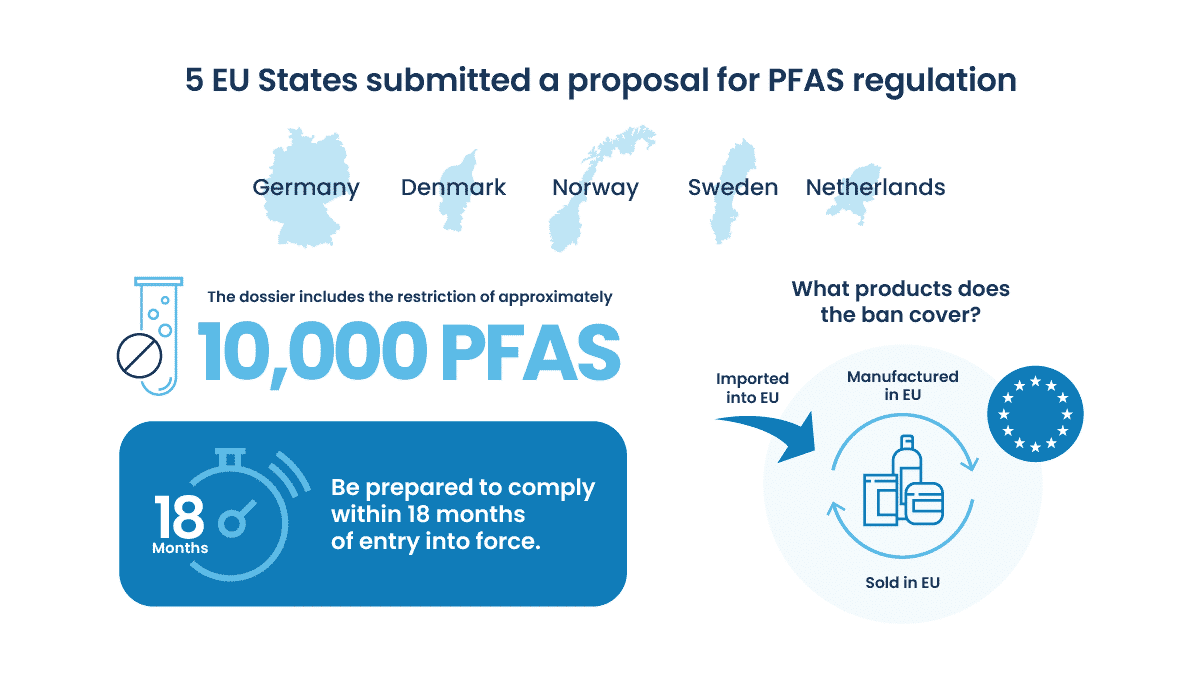 EUの化学物質規制の主な仕組みは、化学物質の登録・評価・認可・制限(REACH)規則です。 EUの5カ国(ドイツ、デンマーク、ノルウェー、スウェーデン、オランダ)は最近、PFAS規制の提案書(書類)を欧州化学品庁(ECHA)に提出しました。 この書類には、EU向けの約10,000種類のPFASの規制が含まれています。 行政手続きに従います:ECHAがパブリックコメントを受け取り、ECHAの委員会が意見を提出し、欧州委員会がその法律を施行可能な法律にするかどうかを決定します。 3Eは、新法の発効日は2026年か2027年になるだろうと予測しています。