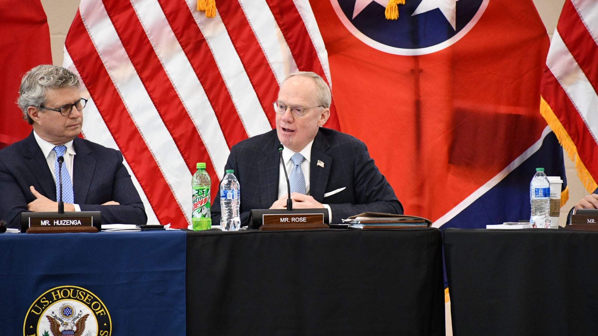 Republican U.S. Representatives Bill Huizenga (Mi.) and John Rose (Tenn.) of the Oversight and Investigations subcommittee of the Financial Services committee addressed a panel of witnesses during an 18 March 2024 hearing in Lebanon, Tennessee on the Security and Exchange Commission (SEC) and the potential implications of its climate disclosure rules. (Credit: U.S. House of Representatives.)