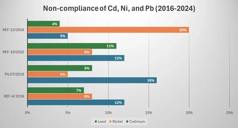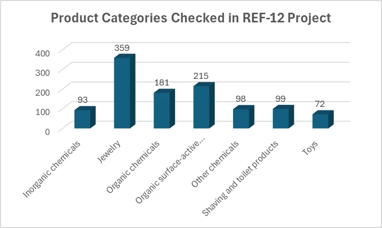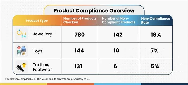 Across 1,329 inspections of restricted substances, 16% of products were non-compliant, particularly in consumer goods - especially jewelry, toys, and textiles.