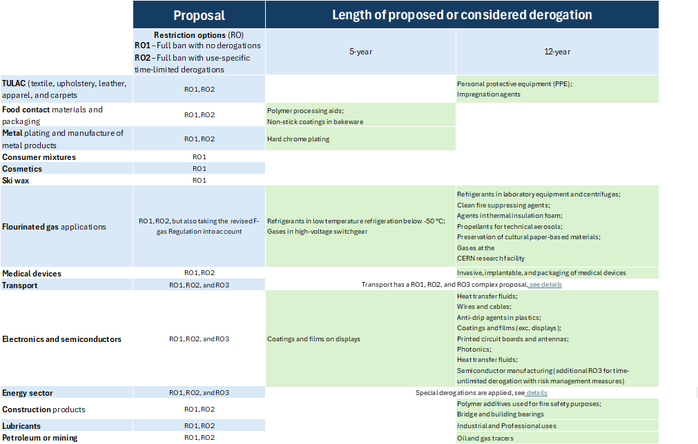 In practice, this significantly expands the number of affected products and sectors. ECHA estimates that roughly 270,000 tons of PFAS were used in major applications like textiles, fluorinated gases, and transport across the European Economic Area in 2020.