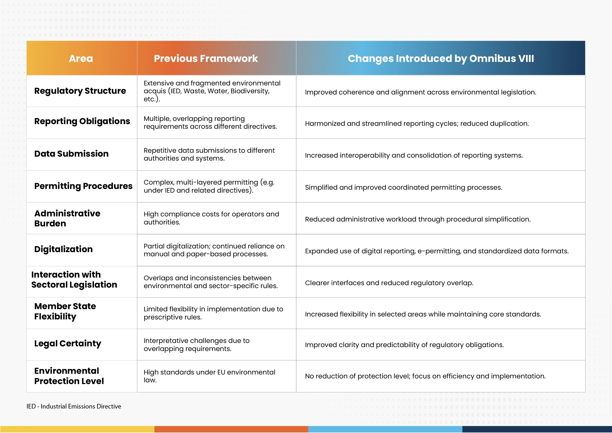 Omnibus VIII represents a further step in the European Commission's broader simplification agenda and focuses on reducing regulatory complexity. The initiative aims to improve coherence, reduce administrative burden, and enhance the practical implementation of environmental legislation while maintaining the European Union's (EU) high standards for environmental protection and supporting the objectives of the European Green Deal.