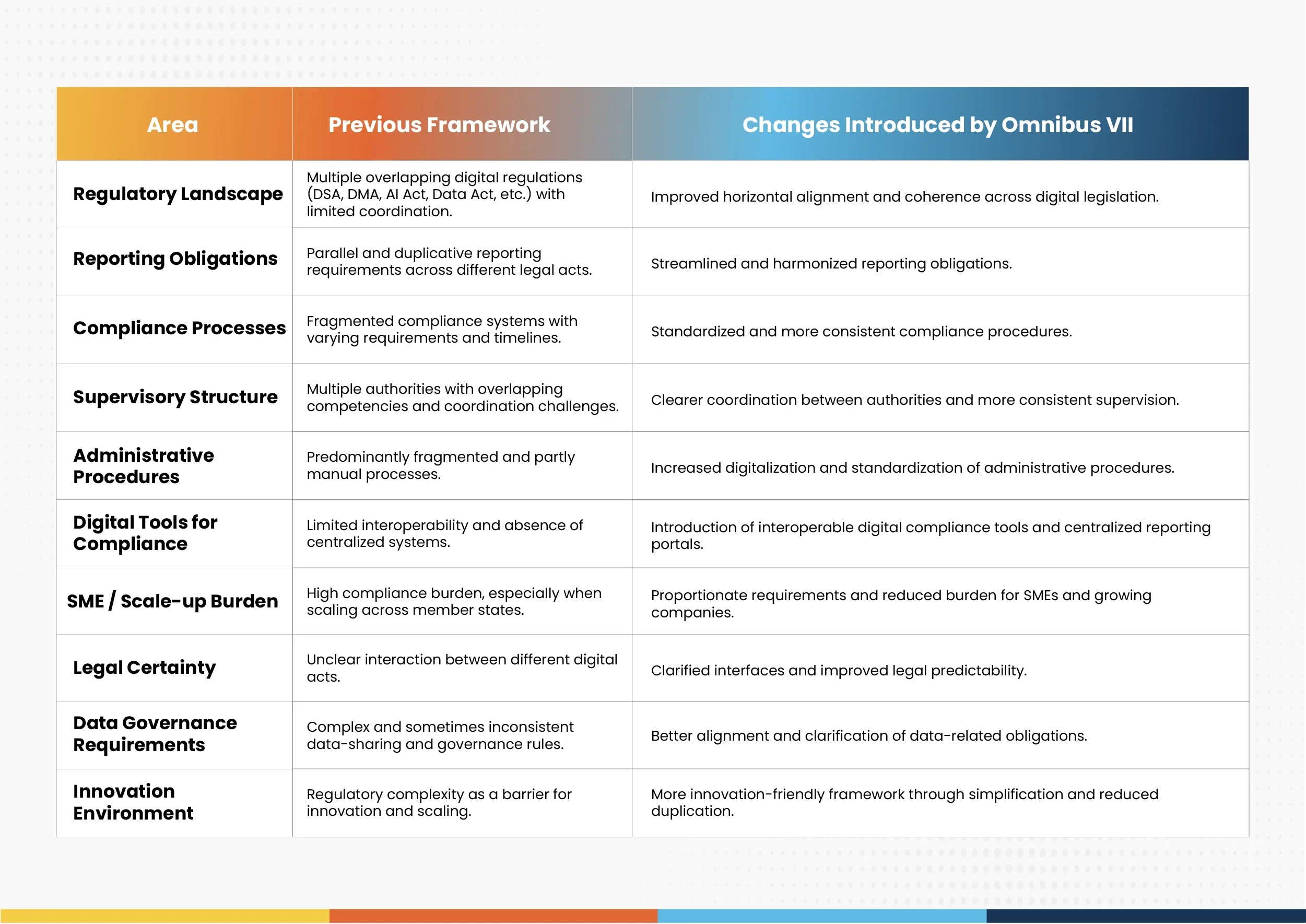 Overall, Omnibus VII represents a strategic recalibration of EU digital governance. By reducing duplication, enhancing interoperability, and promoting proportionate compliance structures, the initiative seeks to strengthen Europe's digital competitiveness while safeguarding trust and fundamental rights in the digital environment.