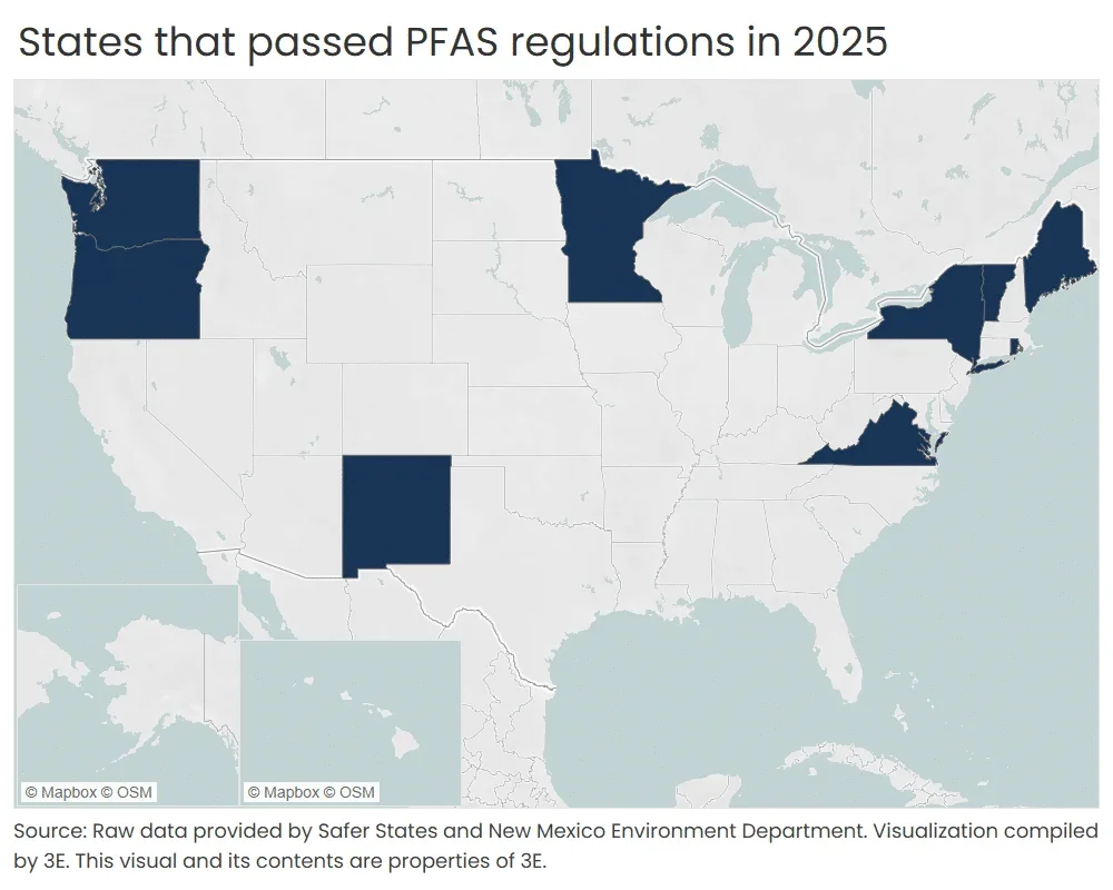 The Old Dominion passed HB 2050 on April 2, 2025, seeking to protect the Occoquan Reservoir from escalating levels of PFAS. The legislation was prompted by the adoption of PFAS MCLs by the EPA and alarming PFAS concentrations found in the reservoir and aims to prevent costly infrastructure upgrades by shifting the burden of remediation to polluters. In a conversation with 3E earlier this year, Delegate David Bulova, who led the legislative effort, explained that without intervention, water utilities faced an estimated $389 million in capital upgrades and millions more in maintenance. HB 2050 instead requires industrial permit holders to test for PFAS in their discharges and reduce levels below EPA thresholds by 2029, aligning with federal compliance deadlines.