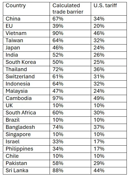 The president said the administration assessed the trade barriers presented by other countries through tactics like tariffs, value-added taxes (VATs), and sanctions, and is imposing a 50% tariff based on that number. The president presented a chart with the following data: