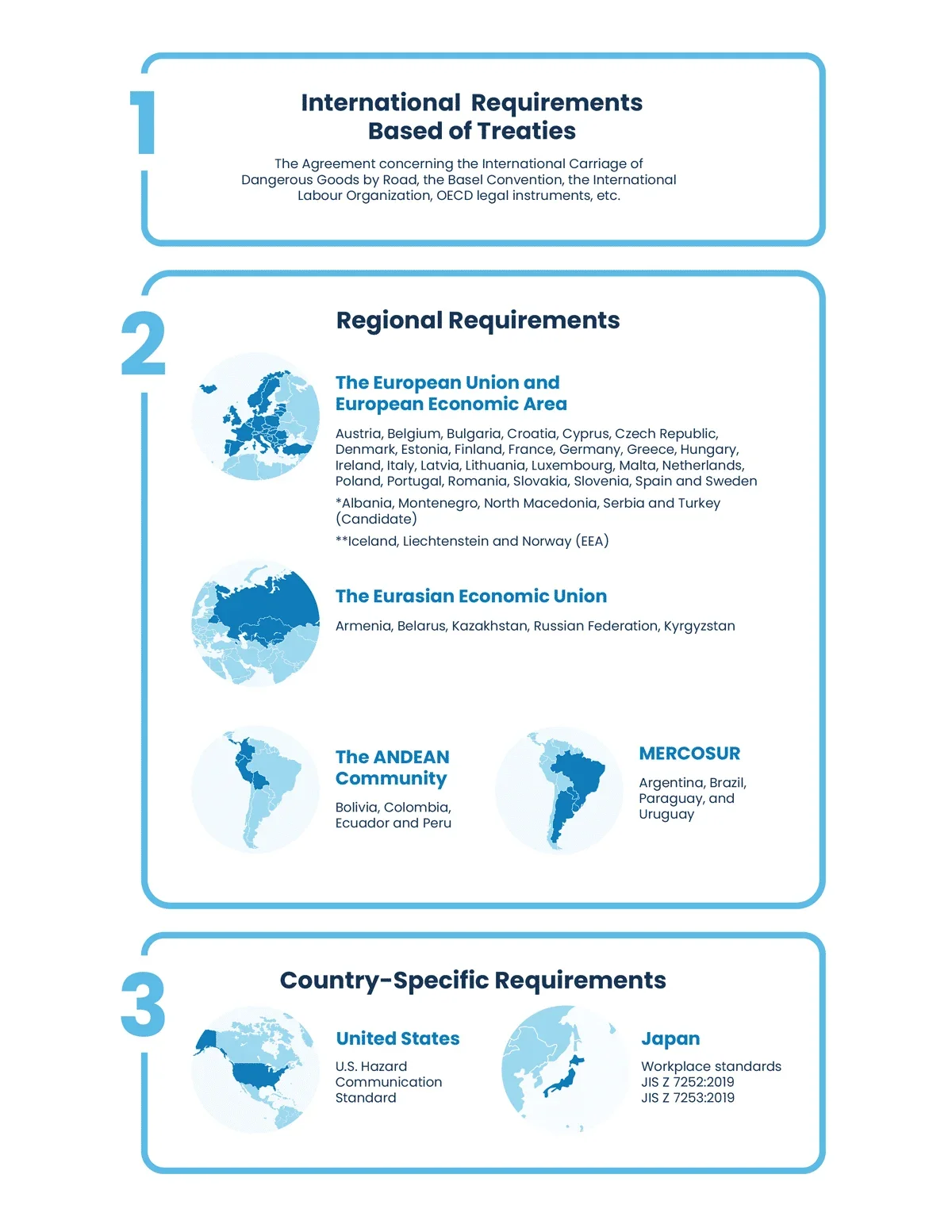 Indeed, international requirements are based on treaties and organizations such as the Convention on International Civil Aviation, the Agreement concerning the International Carriage of Dangerous Goods by Road (ADR), the Basel Convention, the International Labour Organization (ILO), OECD legal instruments and more.