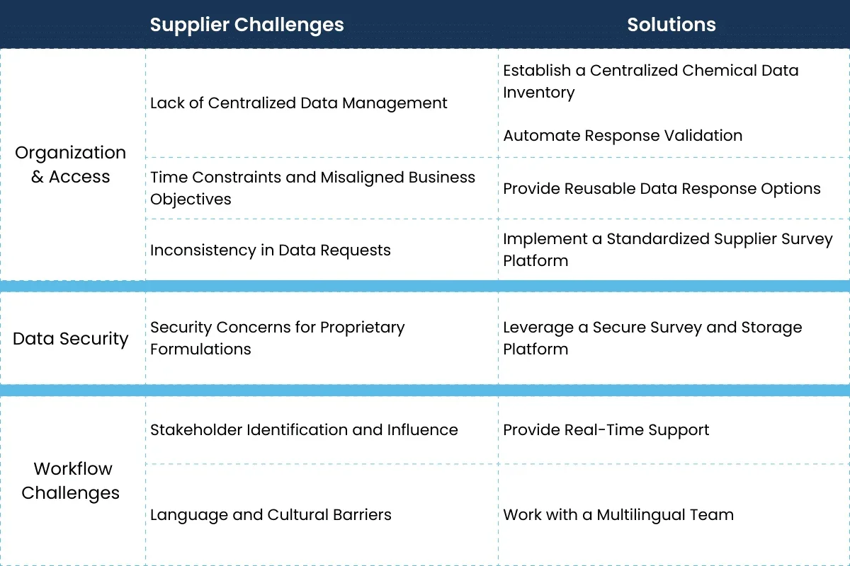 - 独自の配合に対するセキュリティ上の懸念:サプライヤーは独自の化学製剤を持っており、機密性の高い製品データや独自の情報を共有することをためらう場合がある。機密保持契約を結んでいても、データ・セキュリティ上の懸念から、サプライヤーが情報公開をためらう場合がある。