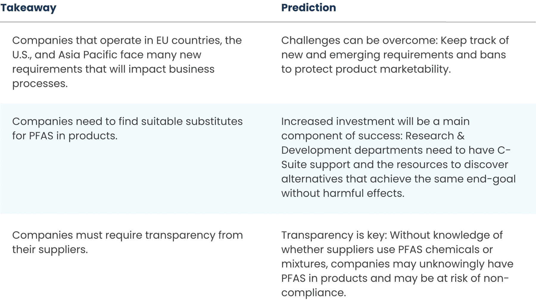 戦術的には、各国はPFASを管理するために数多くの法令や規制スキームを採用しています。 例えば、米国だけでも、PFASは有害物質規制法(TSCA)、1980年包括的環境対応・補償・責任法(CERCLA)、資源保全・回収法(RCRA)、安全飲料水法(SDWA)の下で規制されています(または間もなく規制される予定です)。 また、米国の各州は、連邦政府の規制とは別に、PFASの使用禁止を定めています。 そのため、特定の州で事業を行う企業は、州ごとの禁止事項と包括的な連邦政府の要求事項の両方に注意する必要があります。